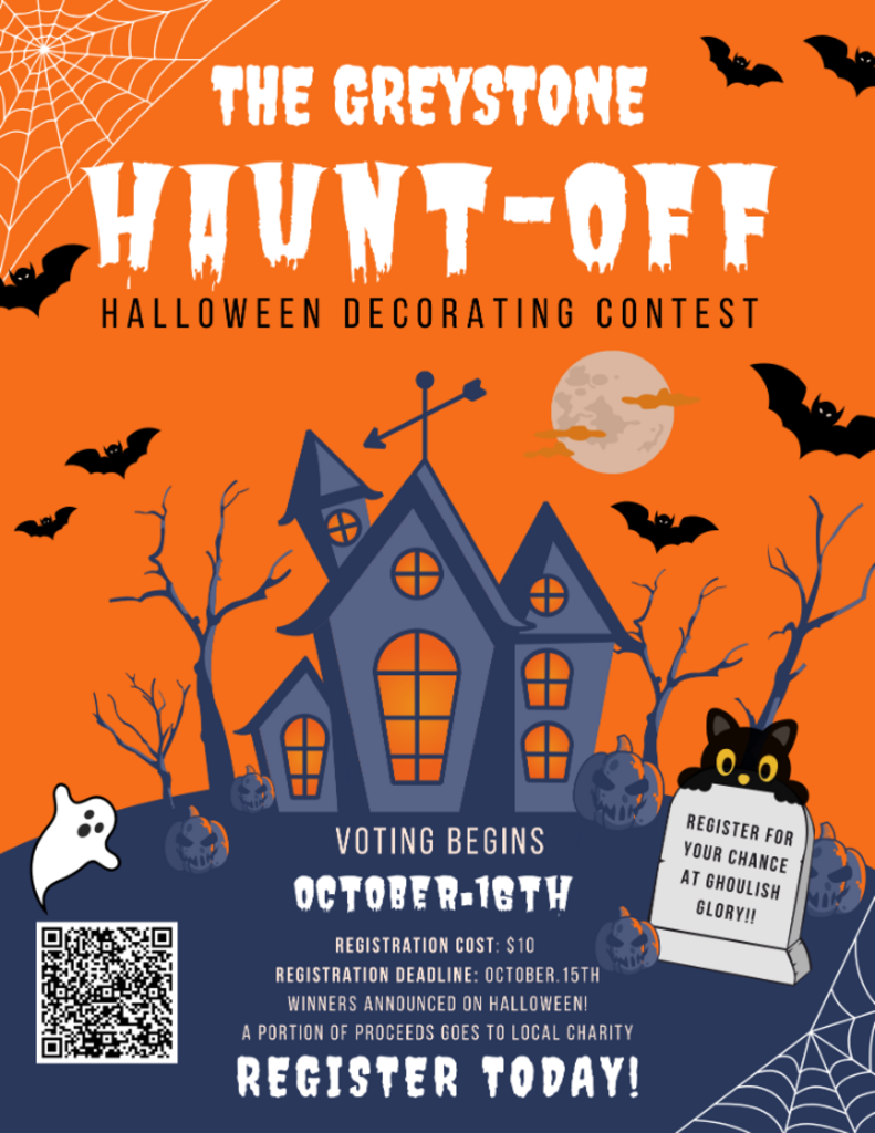 “From pumpkins to potions, skeletons to spells — it’s time to decorate and celebrate! Enter The Greystone Haunt-Off for your chance to wow your neighbours, win prizes, and bring a little extra magic (and mischief) to Greystone this Halloween.”