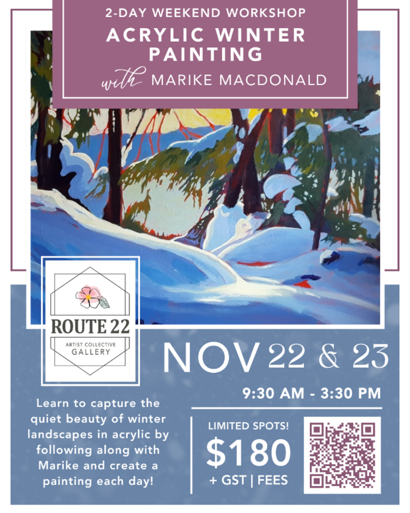 Follow along with Marike MacDonald in this 2-day weekend workshop and learn to capture the quiet beauty of winter landscapes in acrylic painting!