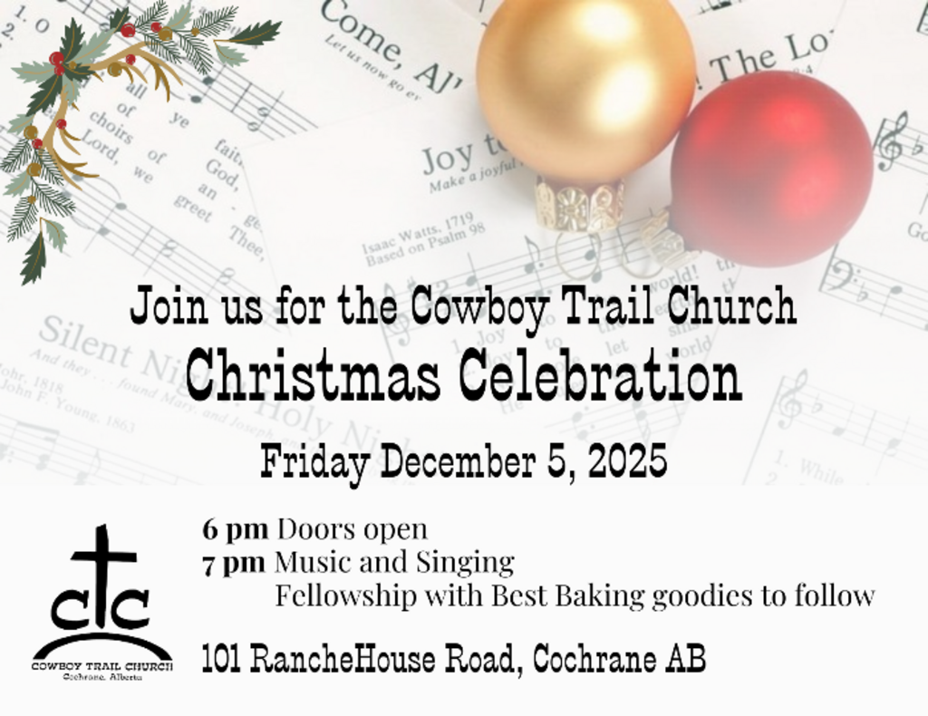 Annual Christmas program hosted by Cowboy Trail Church The doors will open at 6:00 and the program will begin at 7:00. Please join us for a time of singing and celebration. There will be a time of fellowship and an extravaganza of delicious Christmas baking to enjoy.