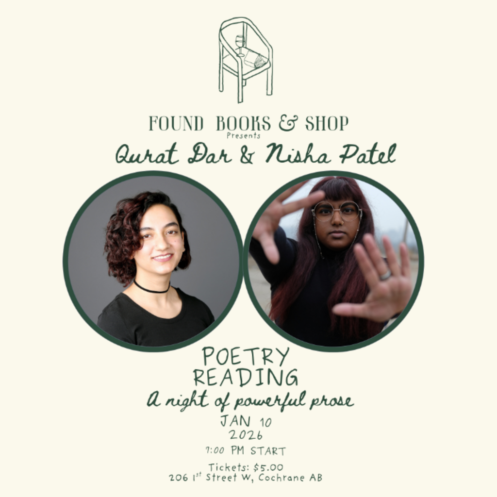 Qurat Dar, Mississauga’s Youth Poet Laureate (2021–2023) and the 2020 Canadian Individual Poetry Slam Champion—brings her sharp, soulful work to Cochrane. Her poems have appeared in Arc, Room, and Canthius, and have been showcased at the Art Gallery of Mississauga and across the TTC. Her debut collection, Non-Prophet, winner of the inaugural Claire Harris Poetry Prize, establishes her as an essential new voice in Canadian literature.
