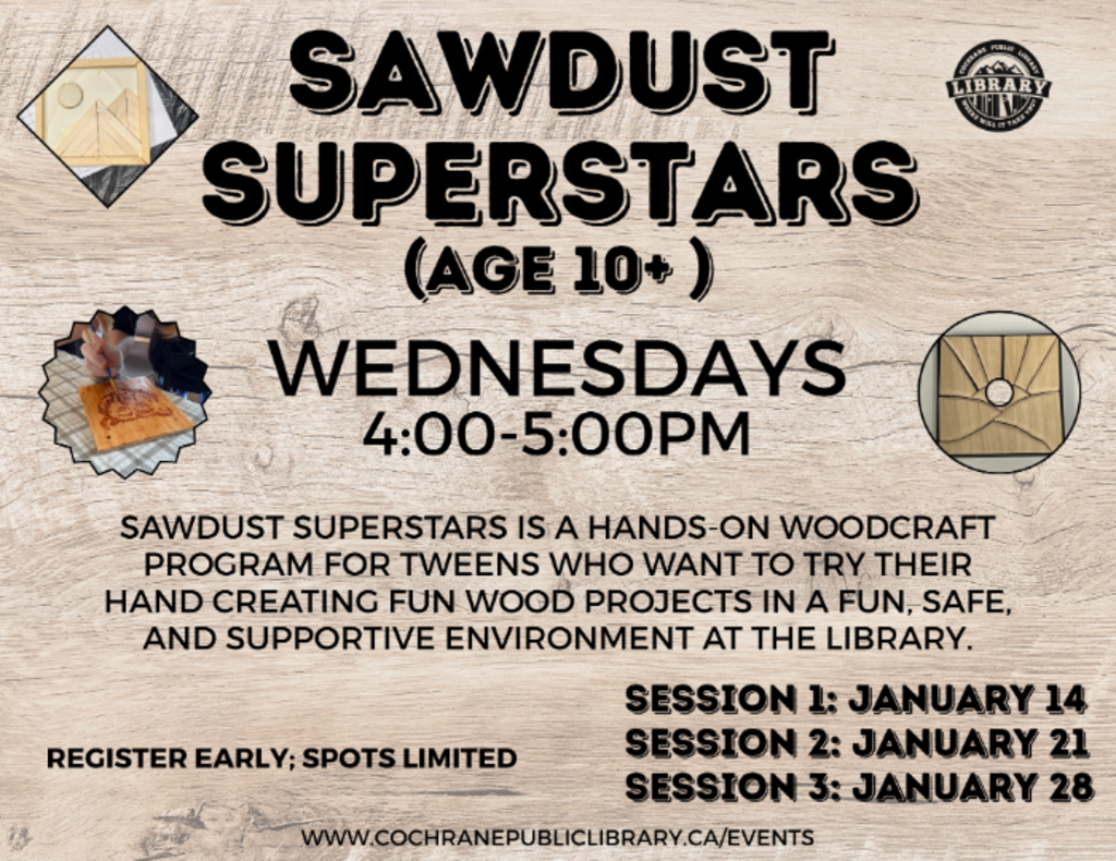Get ready to build, create, and get a little sawdust on your sleeves! Sawdust Superstars is a hands-on woodcraft program for tweens who want to try their hand creating fun wood projects in a fun, safe, and supportive environment at the Library.