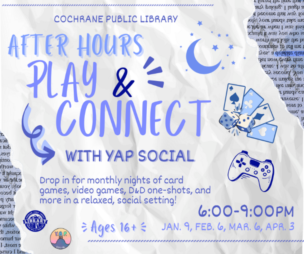 When the library lights dim, the games begin! Join us for an exciting evening of board games, card games, video games, and more at Library After Hours: Play & Connect with YAP Social. This monthly event is designed for ages 16+ to relax, connect, and have fun in a welcoming space.