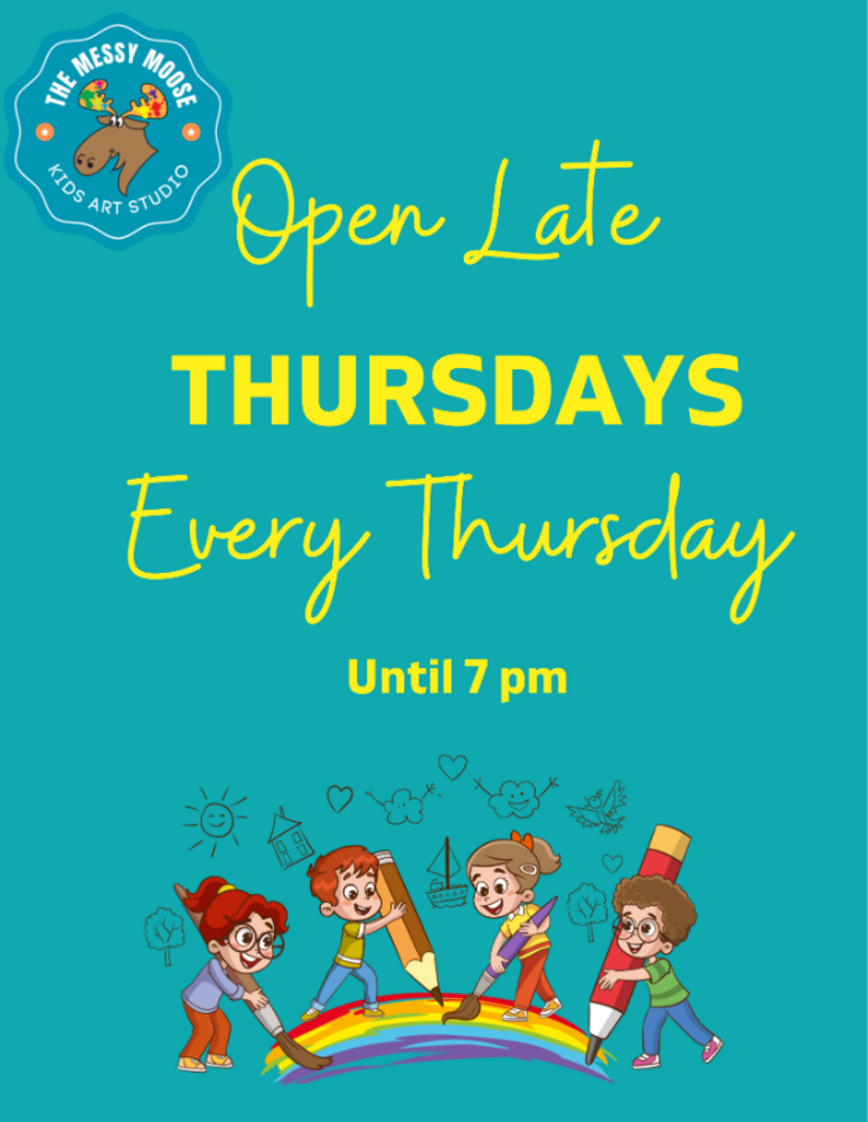 Late Night Thursday is all about big creativity, zero pressure, and the kind of fun that only happens when the day winds down and the studio stays lit. Expect open-ended art stations, sensory play, music, laughs, and plenty of room to experiment, explore, and get messy.