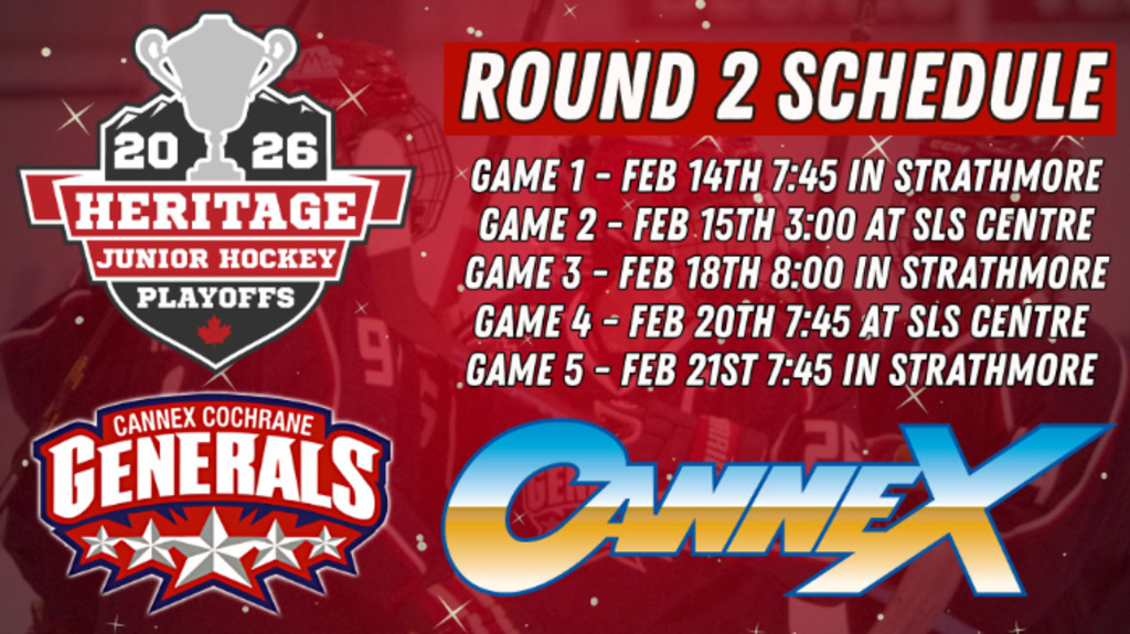 Playoff hockey is back at the SLS Centre, and the intensity keeps rising as the Cannex Cochrane Generals take the ice for Round 2, Game 2 against the Agra Risk Wheatland Kings. Catch all the action live at SLS Centre – Totem 1, where the Generals continue a proud junior hockey legacy that Cochrane has supported since 1984.