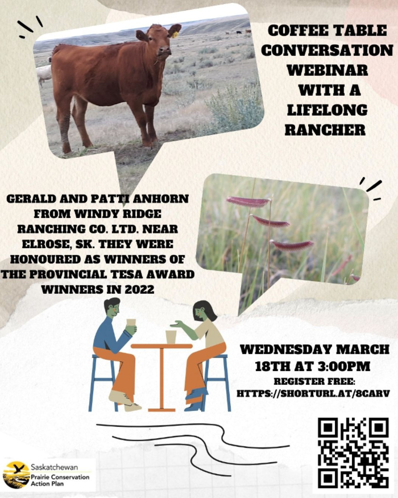 Gerald and Patti Anhorn from Windy Ridge Ranching Co. Ltd. near Elrose, SK will speak about grass and water management. They were honoured as winners of the provincial Environmental Stewardship Award in 2022. Join us for a conversation about why ranchers ranch, their favourite part of their job and the wildlife that they see everyday. They will talk about how they use rotational grazing to increase biodiversity as well as productivity on their farm.